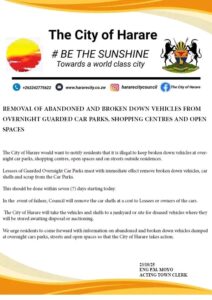 The Harare municipal authority has issued a decree mandating the prompt elimination of deserted and malfunctioning vehicles from protected parking lots, commercial areas, vacant lots, and residential vicinity streets.In an official statement endorsed by Acting Town Clerk Eng. P.M. Moyo, the city cautioned against the unlawful storage of inactive vehicles in such locations, citing their contribution to urban deterioration and traffic congestion.